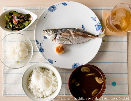 今日の賄いは、昨日買ってきたあじを流用して塩焼きと、たことわかめときゅうりの酢の物、ブイヨンスープにマッシュルームを浮かしていただきました。