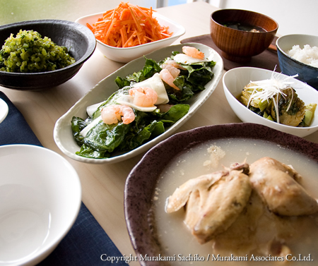 冷凍していた参鶏湯を温め、冷凍むきエビをほうれん草とかぶと一緒にあえてサラダにし、かぶの葉は電子レンジでチンしておひたしに。ちょっと残った冷凍イカは肝と一緒に炒めて、食卓に並びました。