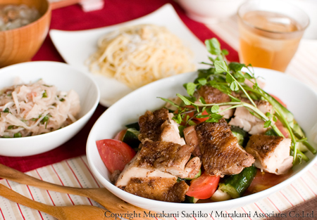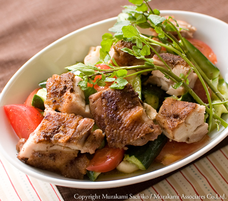 夏野菜とスパイスをきかせたチキンのサラダです。暑い夏の季節、食欲が落ちてもしっかり頂けます。パーティーメニューにもピッタリ。